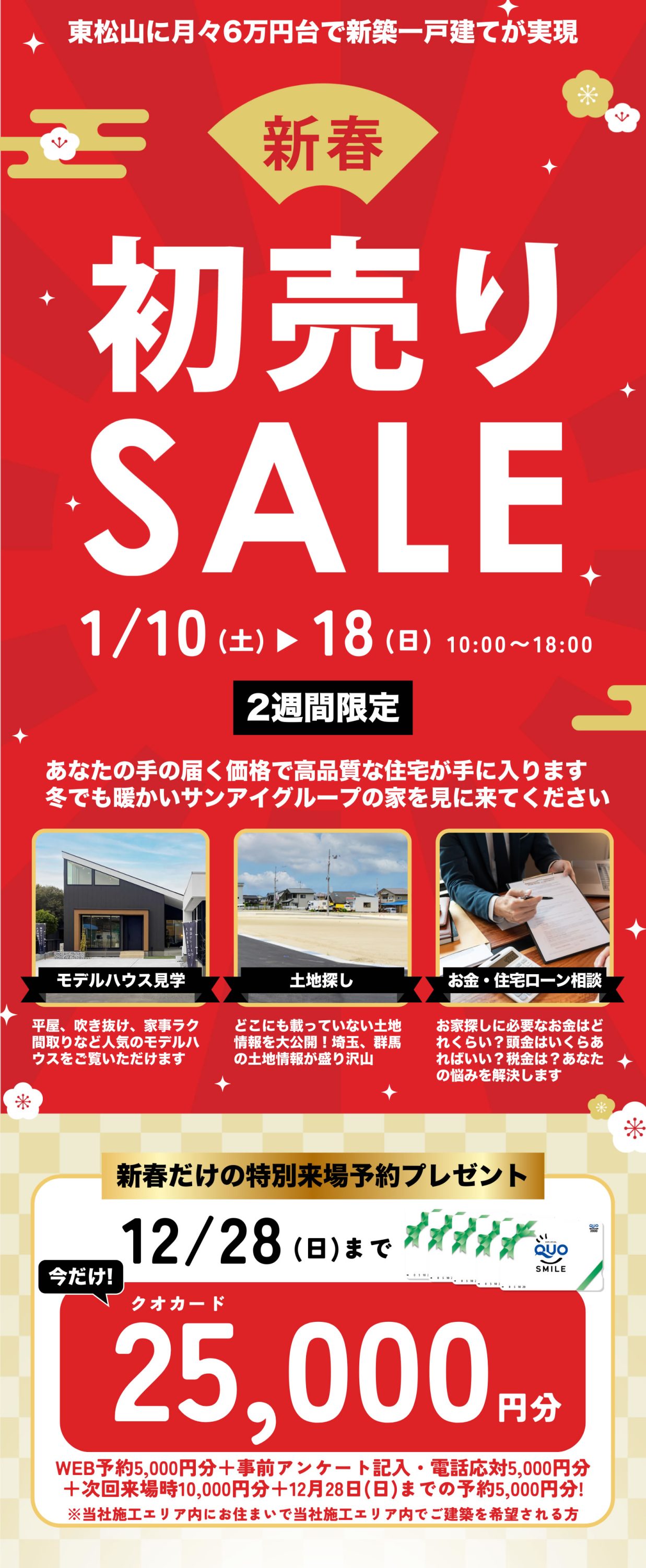 2025年12月28日(日)までにサンアイホーム東松山店で開催する「新春住まいるフェア」を予約して来場することで、通常プレゼントしている10000円分のクオカードを25,000円分にしてお渡しします