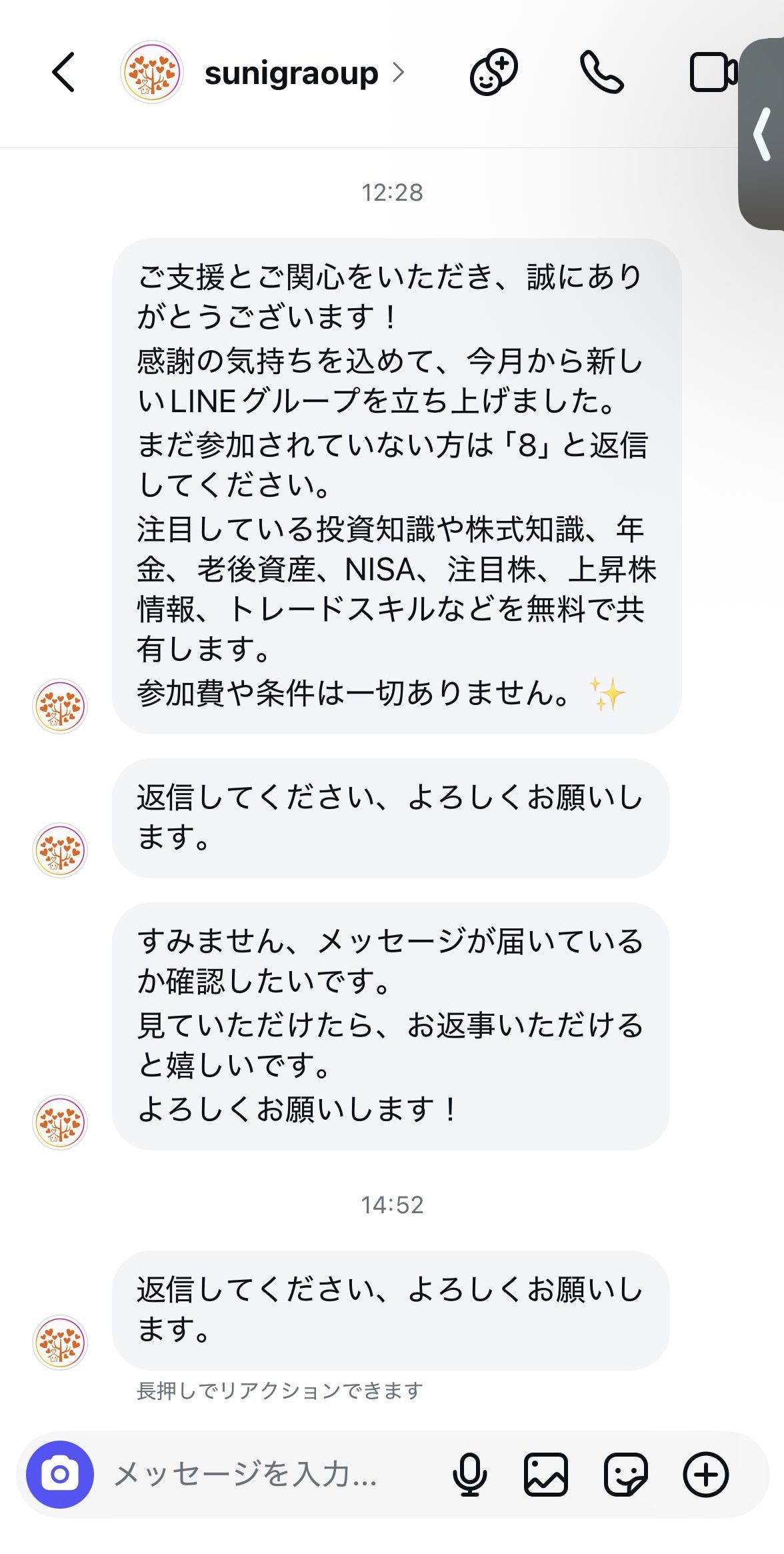 ・アカウント名が「sunai」「sanaigroup」「sunigraoup」など、似せた表記になっている