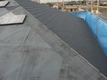 屋根の部材は色々あると思いますが、今回はスレート屋根です屋根の構造としては、2階柱、梁から束へ、束から母屋、母屋から垂木、垂木から野地板と順に組み上げられますその後、ルーフィング(防水シート)を貼り、室内に水が入らないように規定値以上の重ね代で施工されスレート材で日射や雨や雪などの外部から建物を守ります