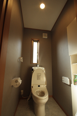 トイレのほうも暗めのクロスと一体型便器、トイレ埋め込み収納、隣のユニットバスの無駄なスペースの分までトイレを広げているのでとても広々で安らぎ間違いなしですup