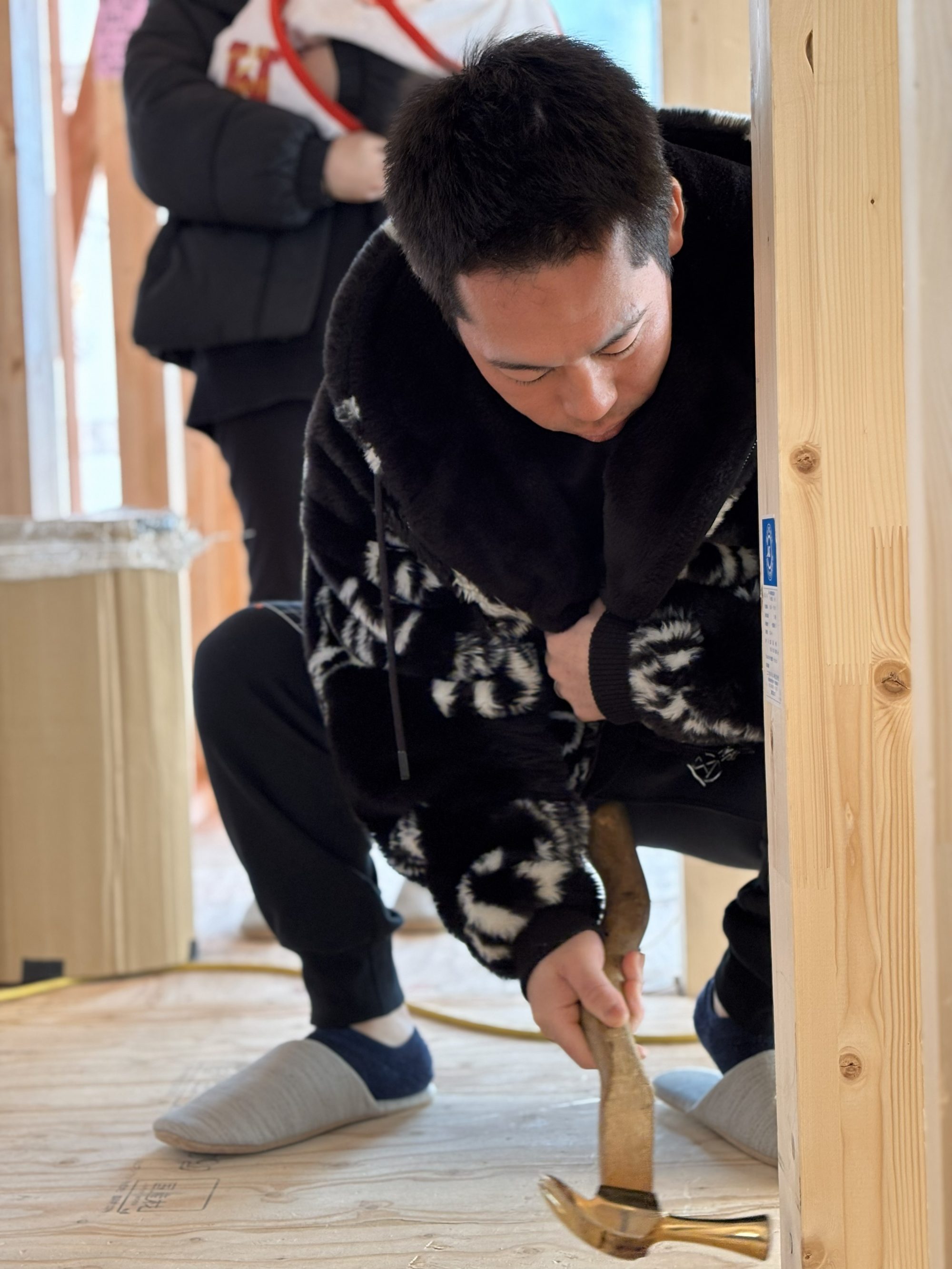 まずは奥様から柱にピン打ちをしてもらいました☆