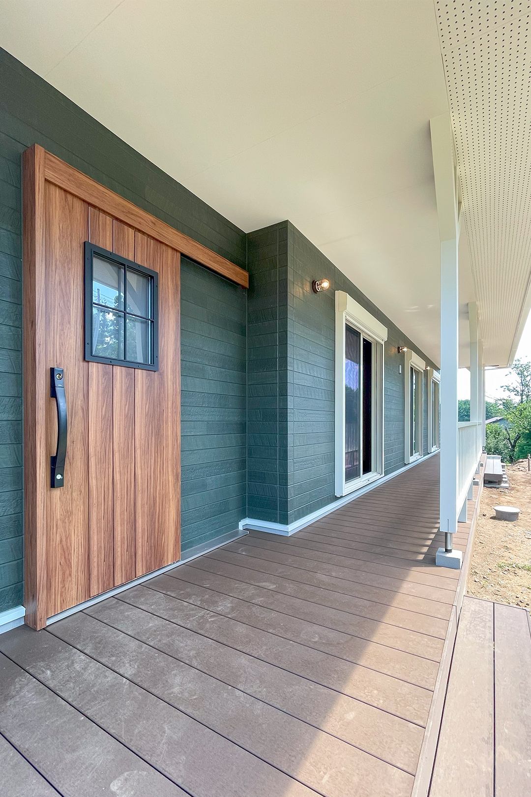 ダークグリーンと自然な木目がとても相性良い素敵な外観です