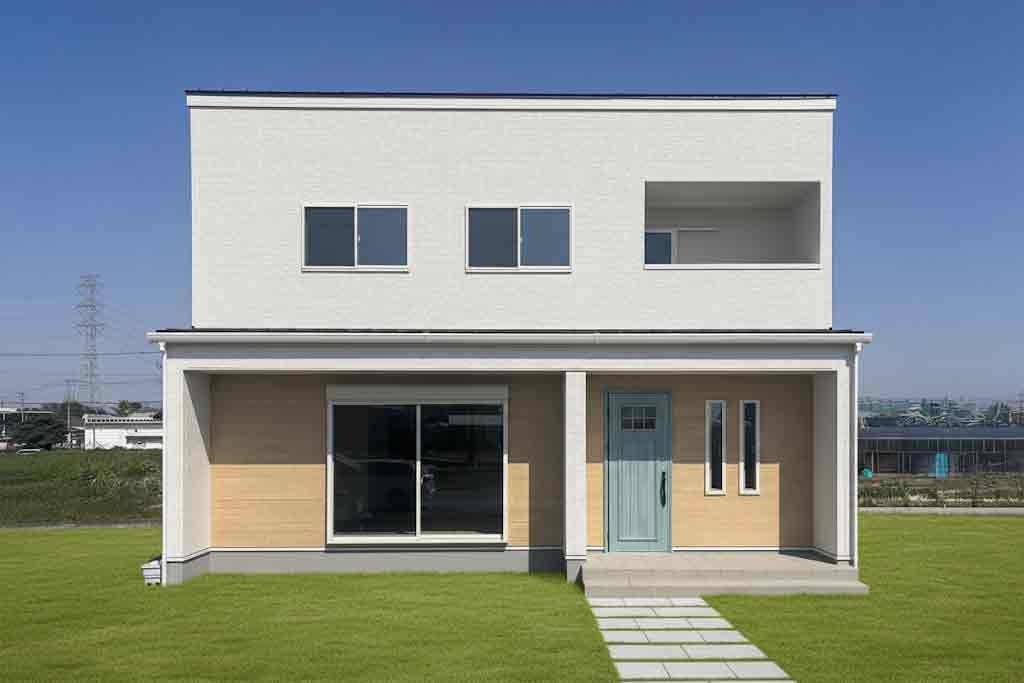 白い外壁に木調のアクセント。そしてブルーグリーンの玄関ドアがオシャレ感を引き立たせています。ヤシの木が合いそうな外観です。