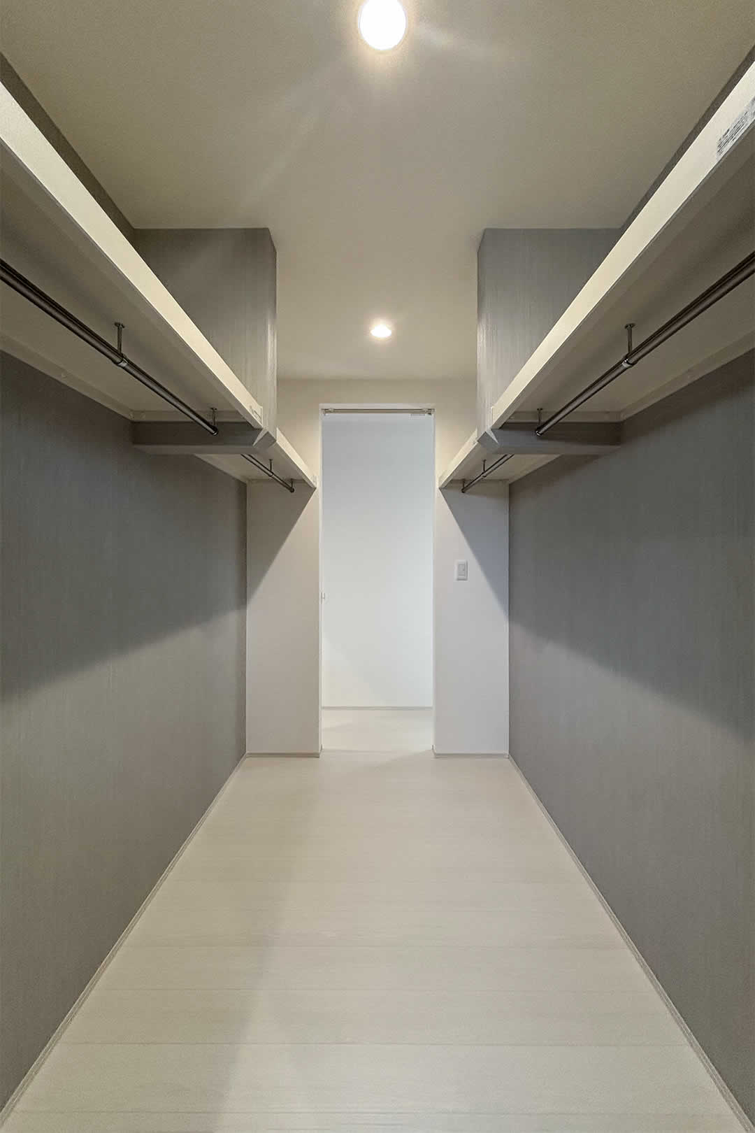 お部屋の中心にあるファミリークローゼットは、洋服だけでなく季節家電など普段使用しないものもしまえて便利です。ランドリールームにも繋がるので洗濯動線の時短になります。