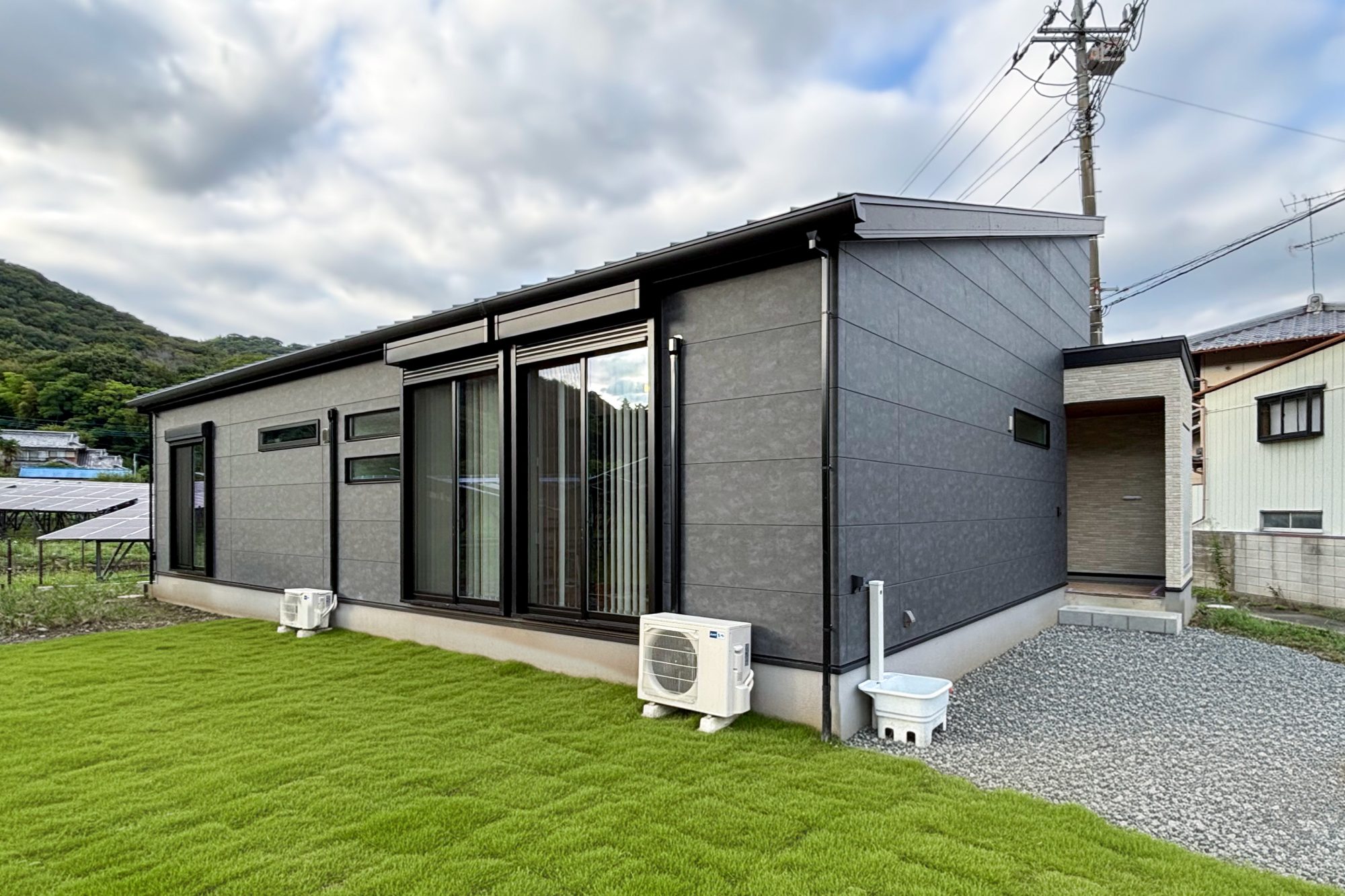 ガルバニウム屋根とブラックの外壁がスタイリッシュで存在感ある佇まいです。