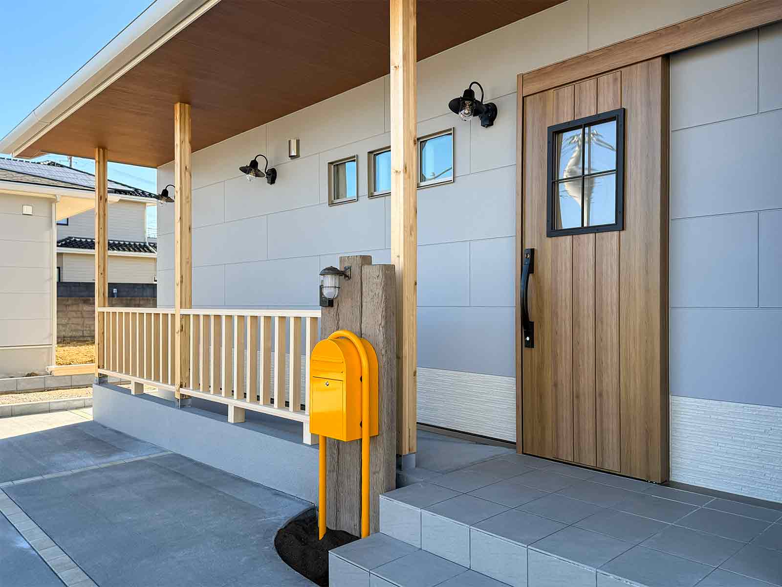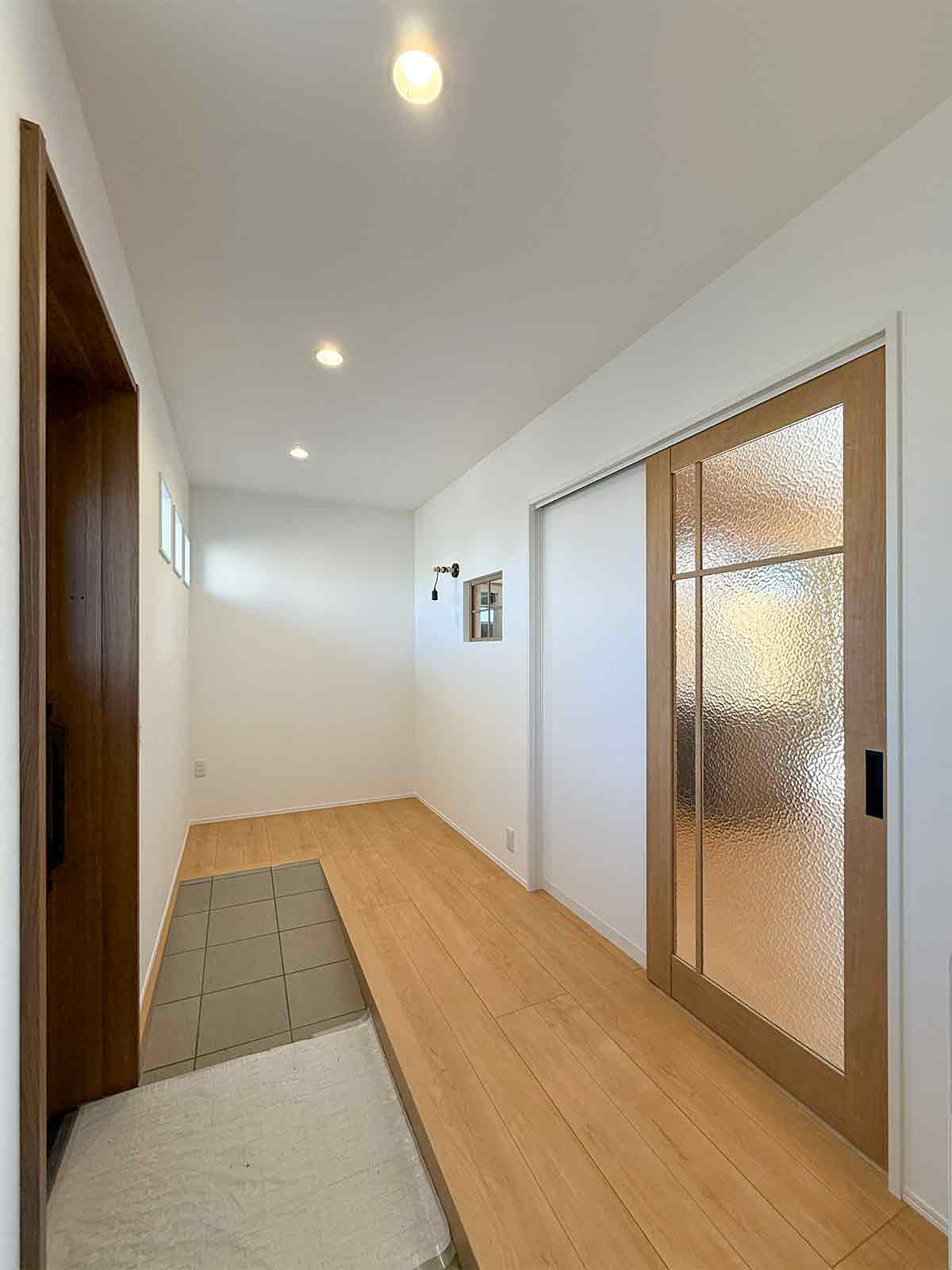 ゆるいスロープのついた玄関ホール。キッチンにつながるデコマドと、リビングドアとの組み合わせで開放感のある明るい空間です。