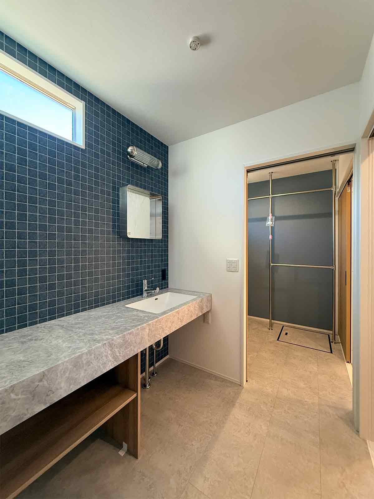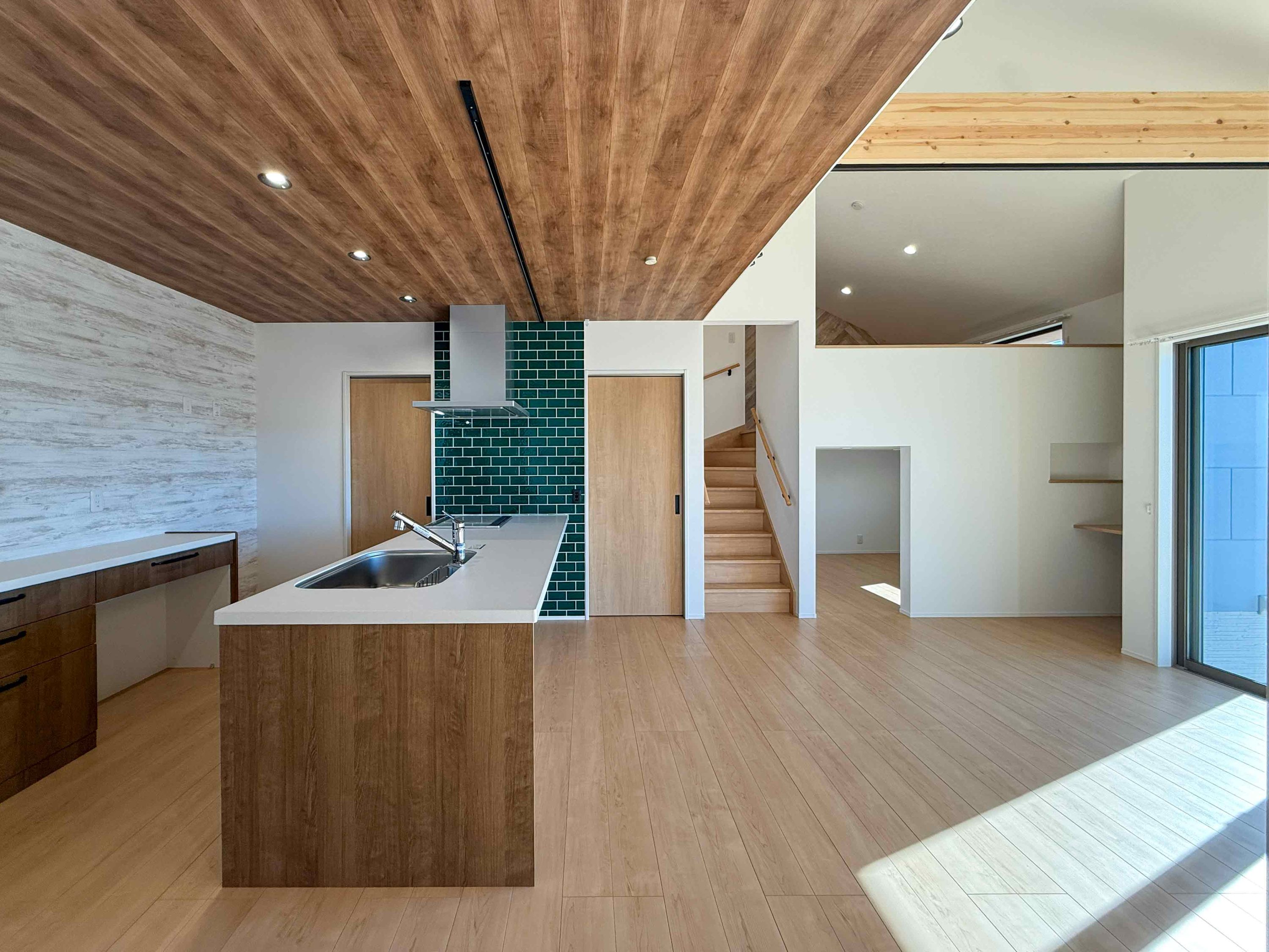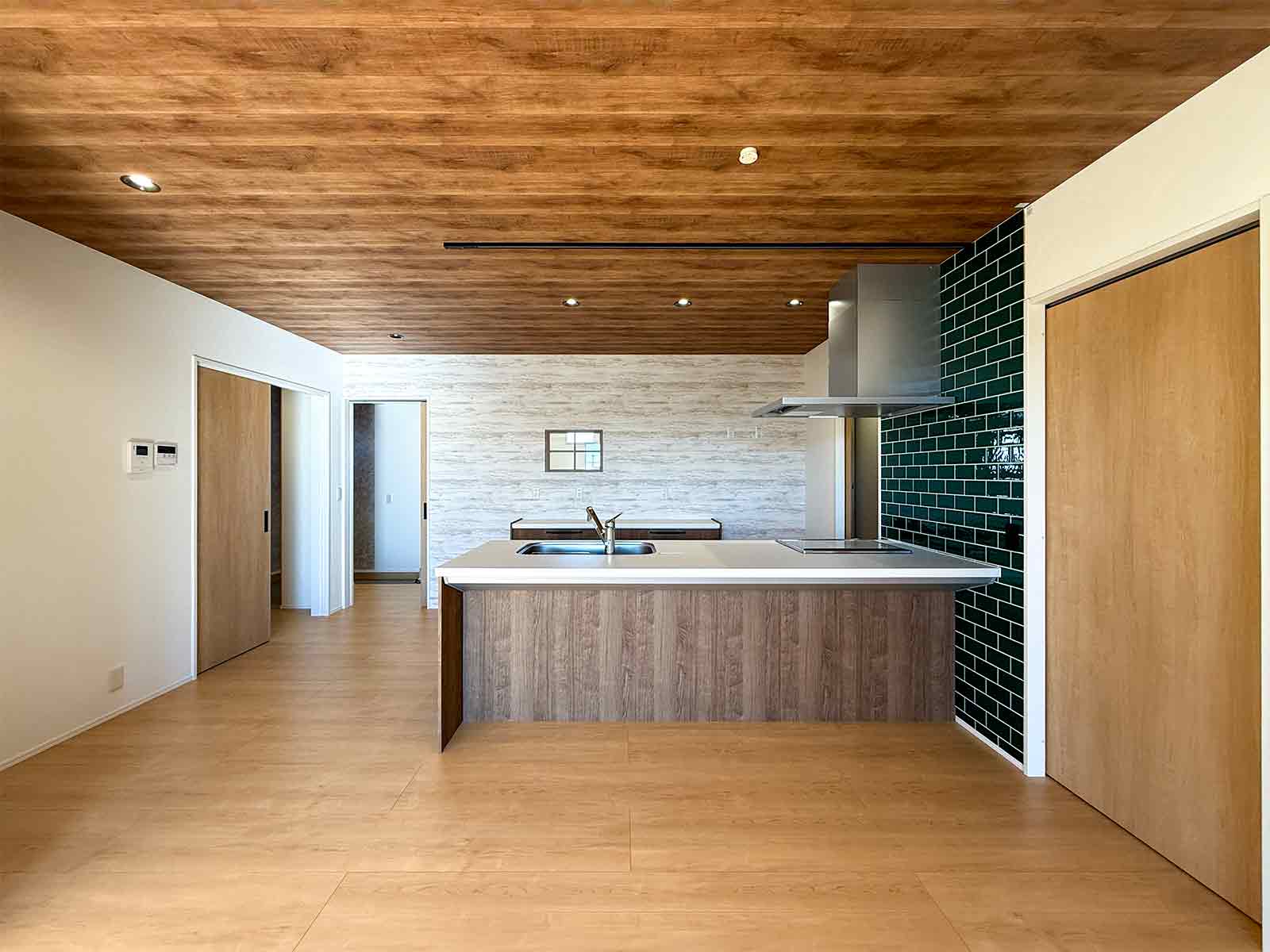 モスグリーンのタイルが印象的なオープンキッチン。毎日のお料理が楽しみになります。