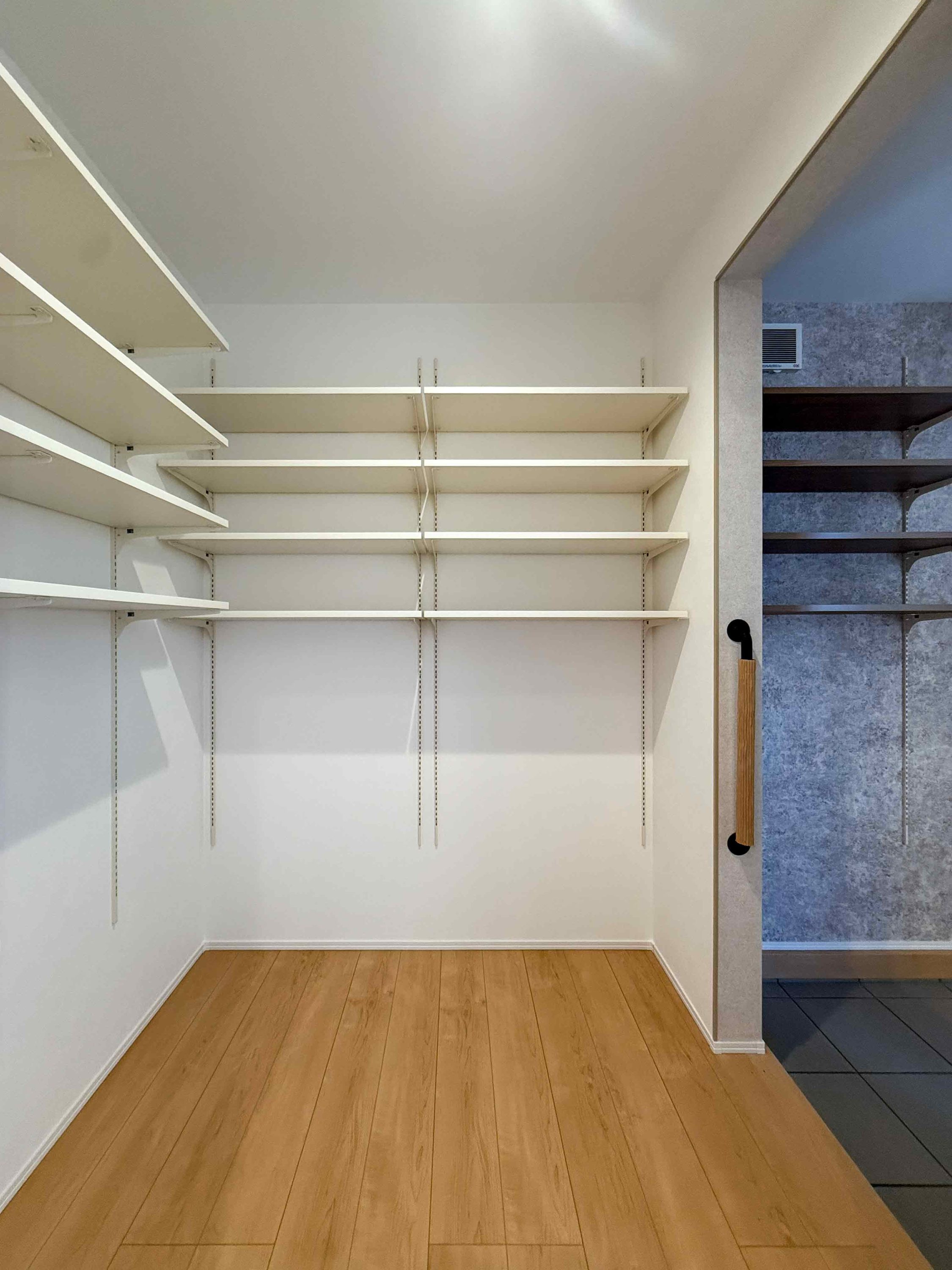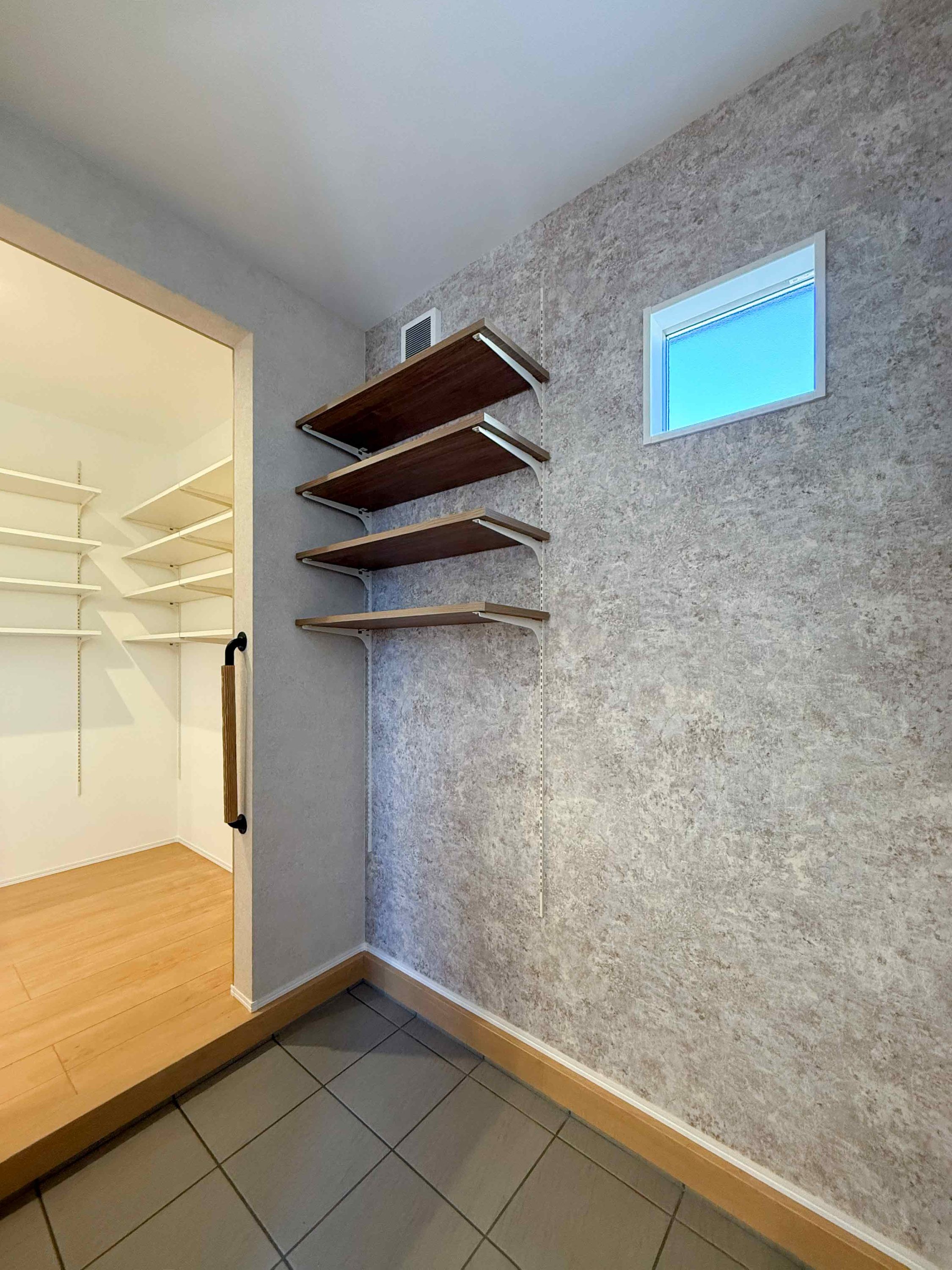 たくさんの棚がついた土間・玄関収納。帰ってすぐに荷物が置ける便利な動線です。