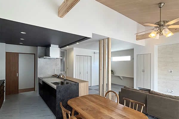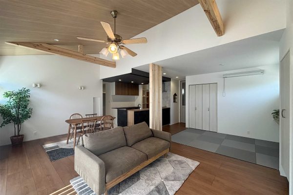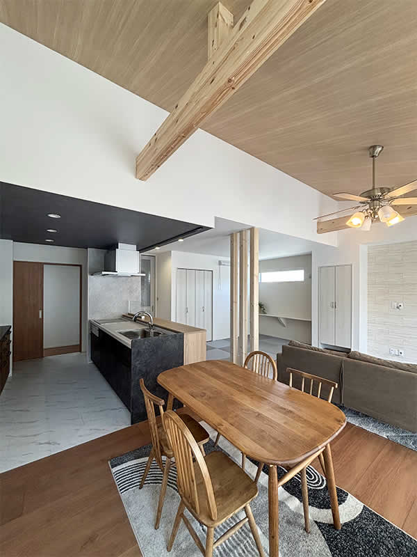 折上げ天井、梁が見える勾配天井は開放感がありながら印象的なLDKになりました。