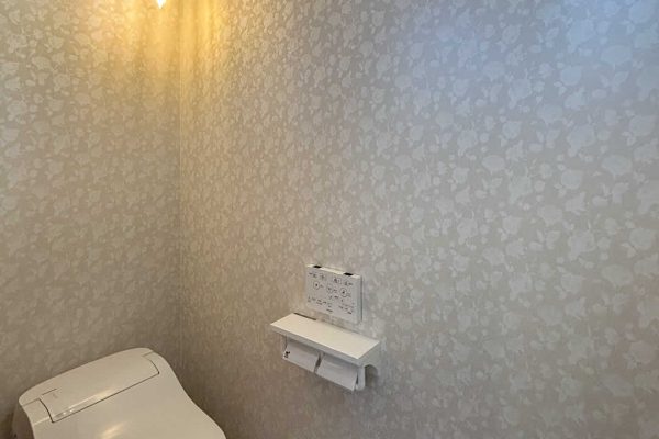 タンクレストイレでスッキリ、花柄クロスとペンダントライトが優しい空間に。