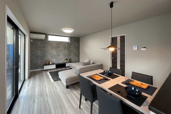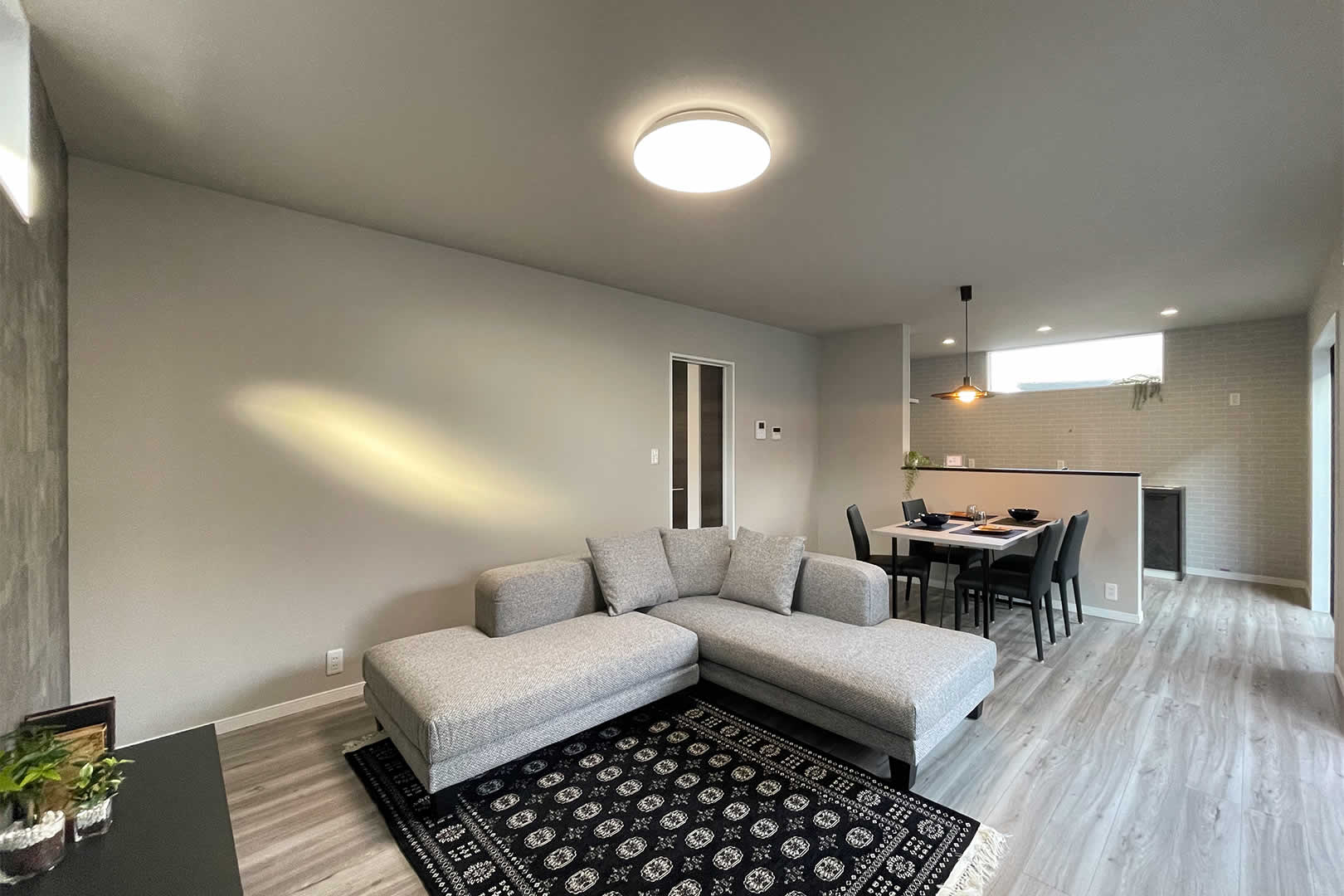 グレーを基調としたリビングは落ち着いた空間に。南側に大きい窓があるので、リビング内に明るい日差しが入ります。広いリビングで家族団欒のひとときを。