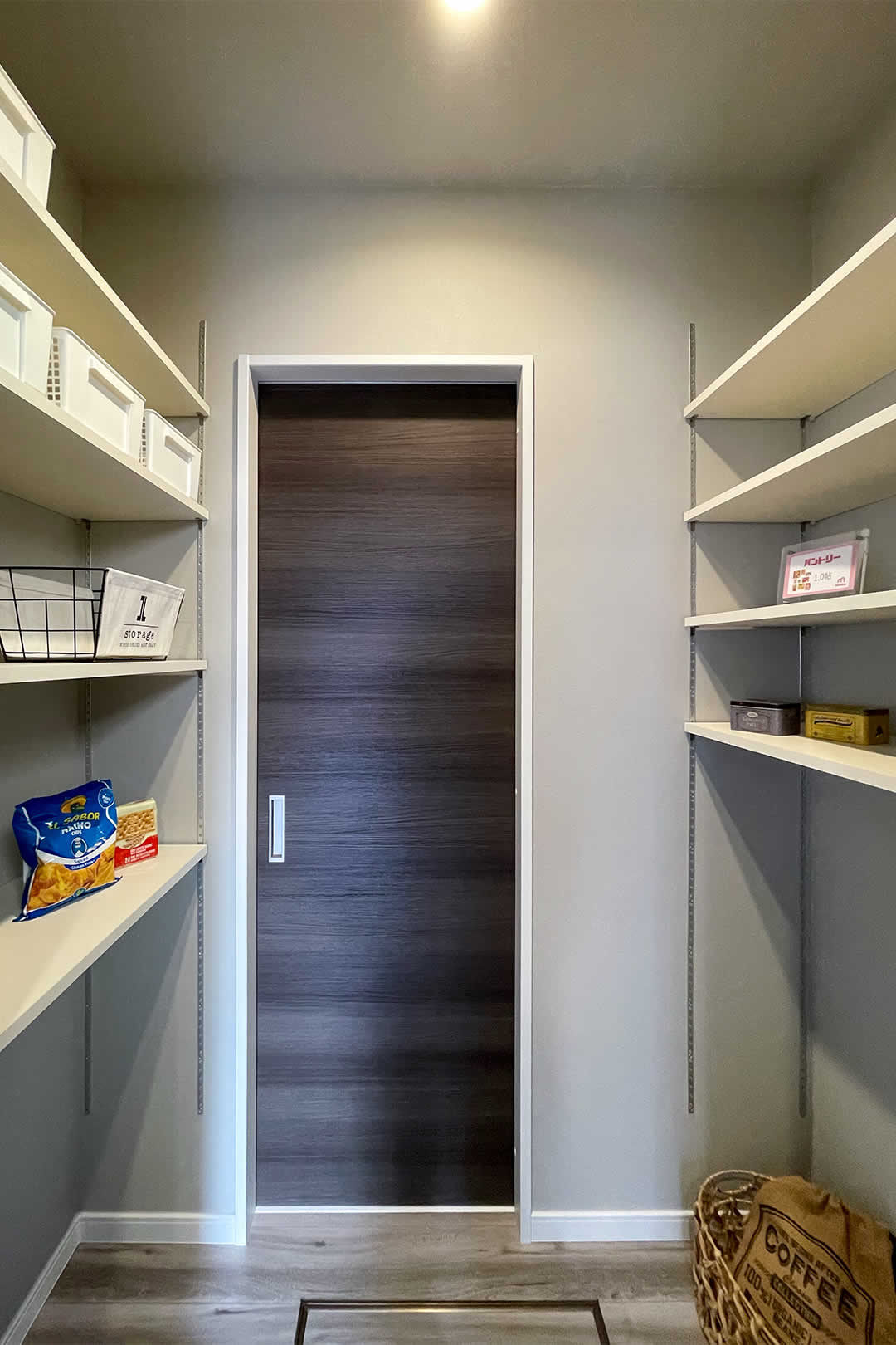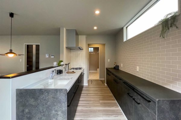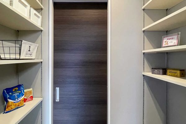 収納たっぷりなキッチンです。キッチン後ろの壁に棚を付けてオシャレに飾り付けることもできます。隣にはパントリーがあり、食品のストックや防災グッズなどの保管に便利です。