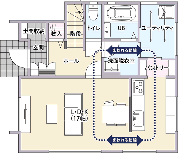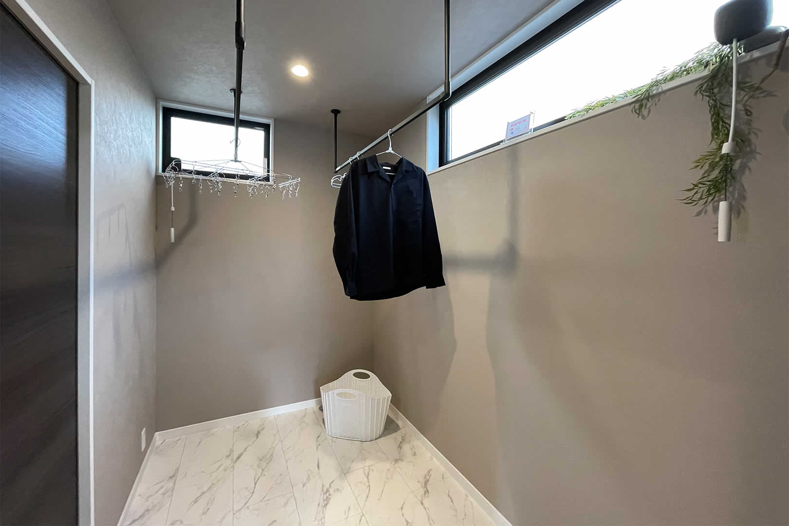 3帖のランドリールームは花粉や梅雨の季節に重宝します。洗濯後にそのまま干せるので2階に行く必要がありません。毎日の時短と家事楽になります。