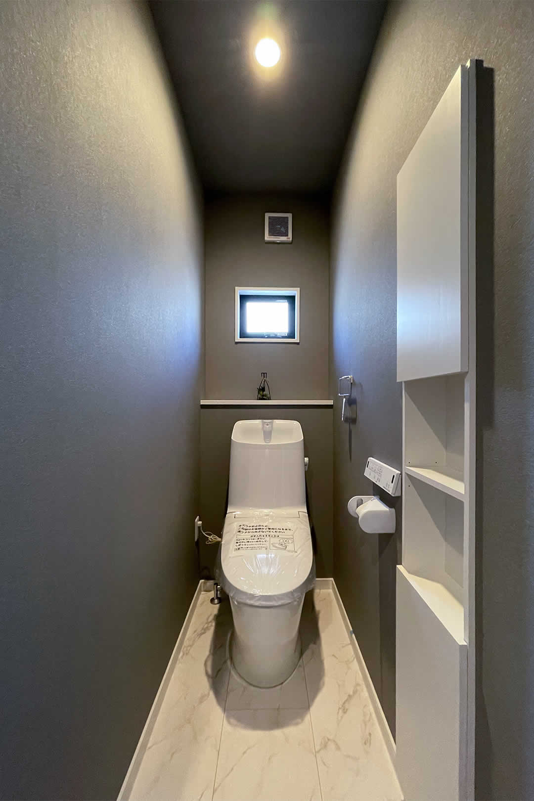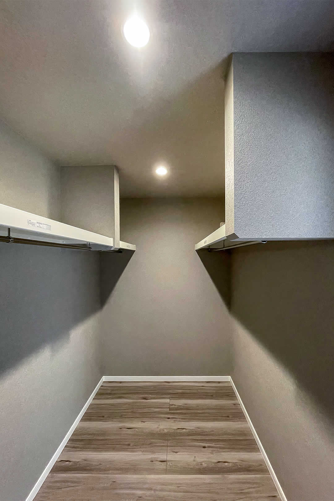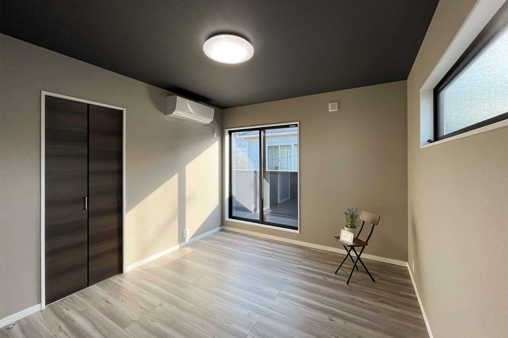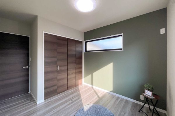 3帖のウォークインクローゼットがついたベッドルームはベッドを置いてちょうど良い広さとなっております。天井をダーク色することにより、落ち着いて睡眠できる空間を演出しています。