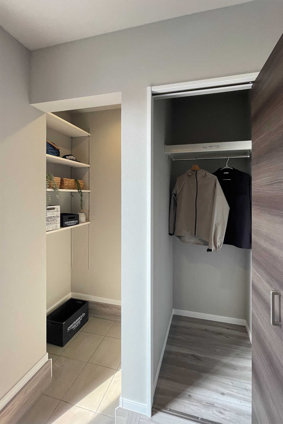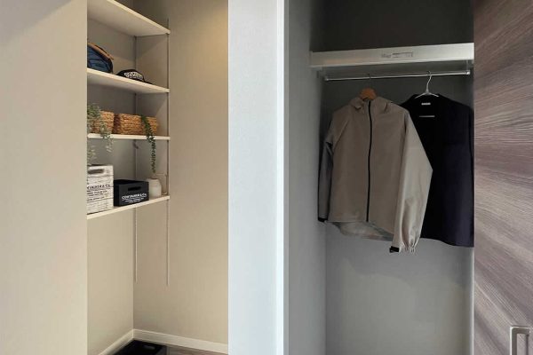 玄関に土間収納とコートなどを掛けられる収納があります。ベビーカーやスーツケースを置いてなど用途は色々。