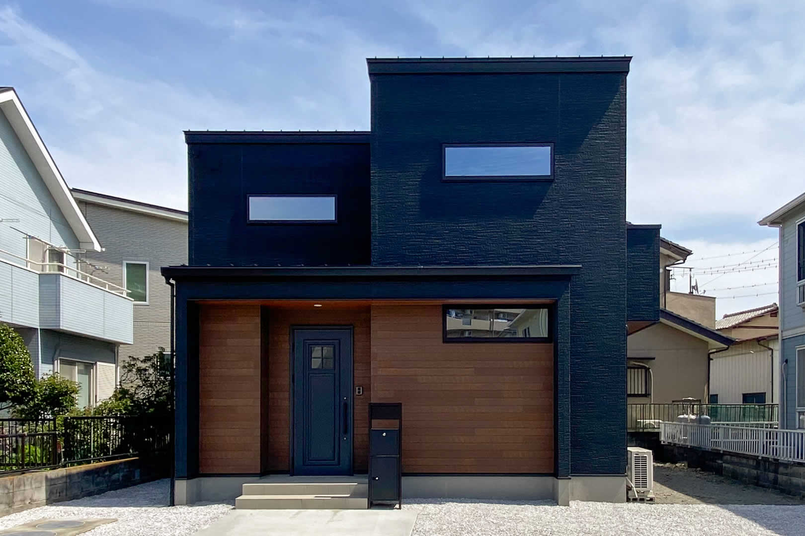 外観はブラックと木調でモダンな雰囲気にし、玄関まわりをオシャレにしました。