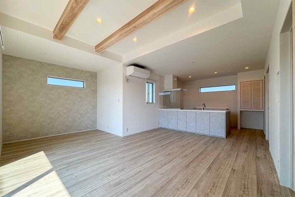キッズルームもある19帖の2LDKは家族が集まる広々とした空間です。折り上げ天井が開放感とオシャレ感をアップさせてくれます。