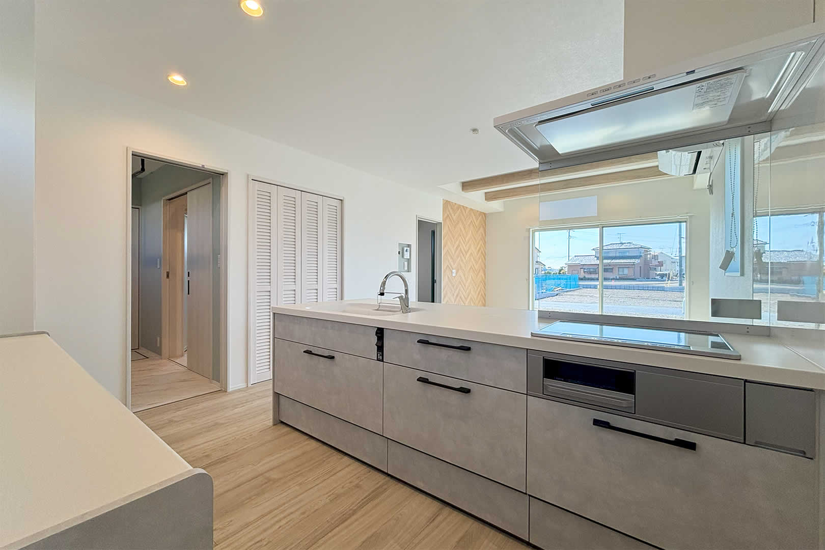人気のオープンキッチン。キッチンからお庭まで見渡すことができ、家族との会話を楽しみながら料理をすることができます。