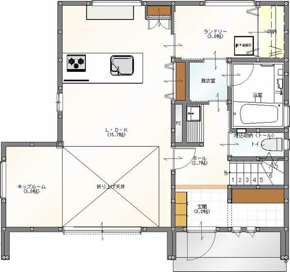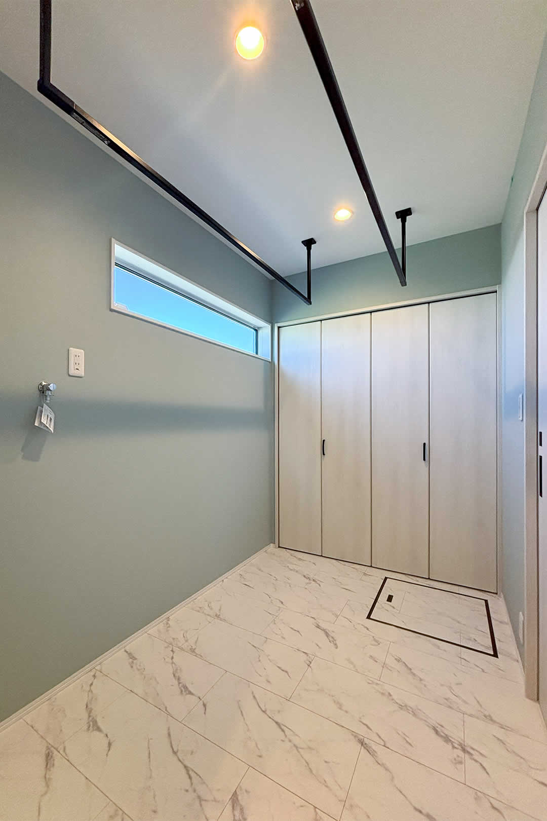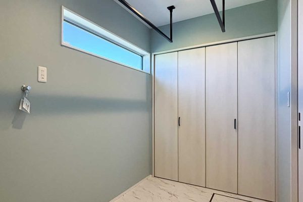 3帖+1帖分の収納がある広々としたランドリールーム。キッチンの横にあることにより忙しいママさんが楽になる家事動線となっています。