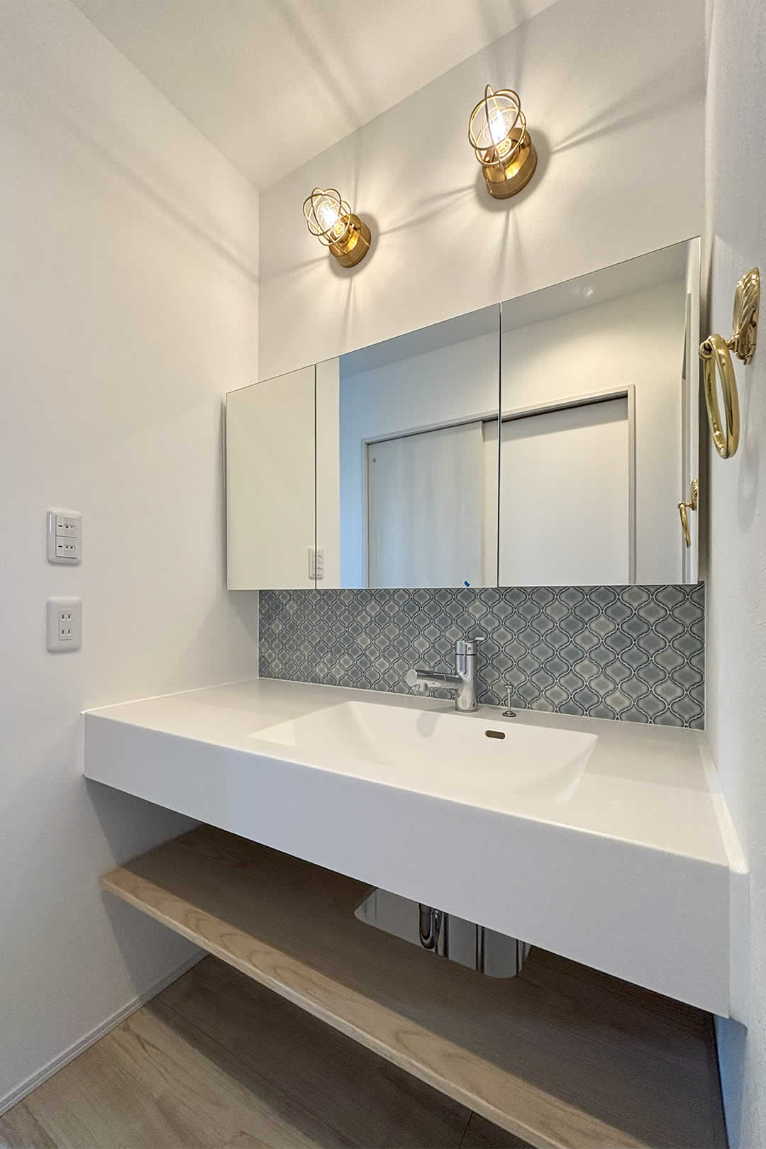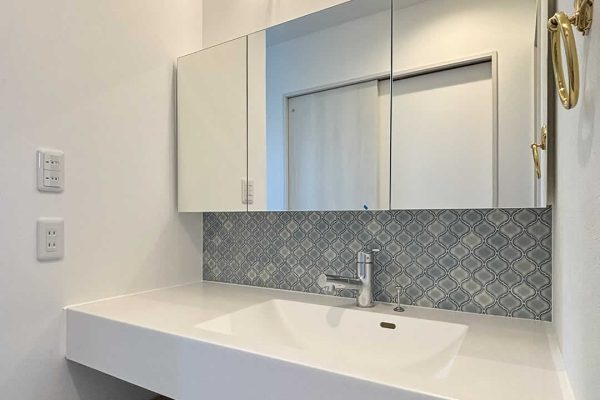 オシャレなカウンター洗面台。横に並んでハミガキや身支度もできます。タイル柄の壁紙と2つの照明がアクセントに。