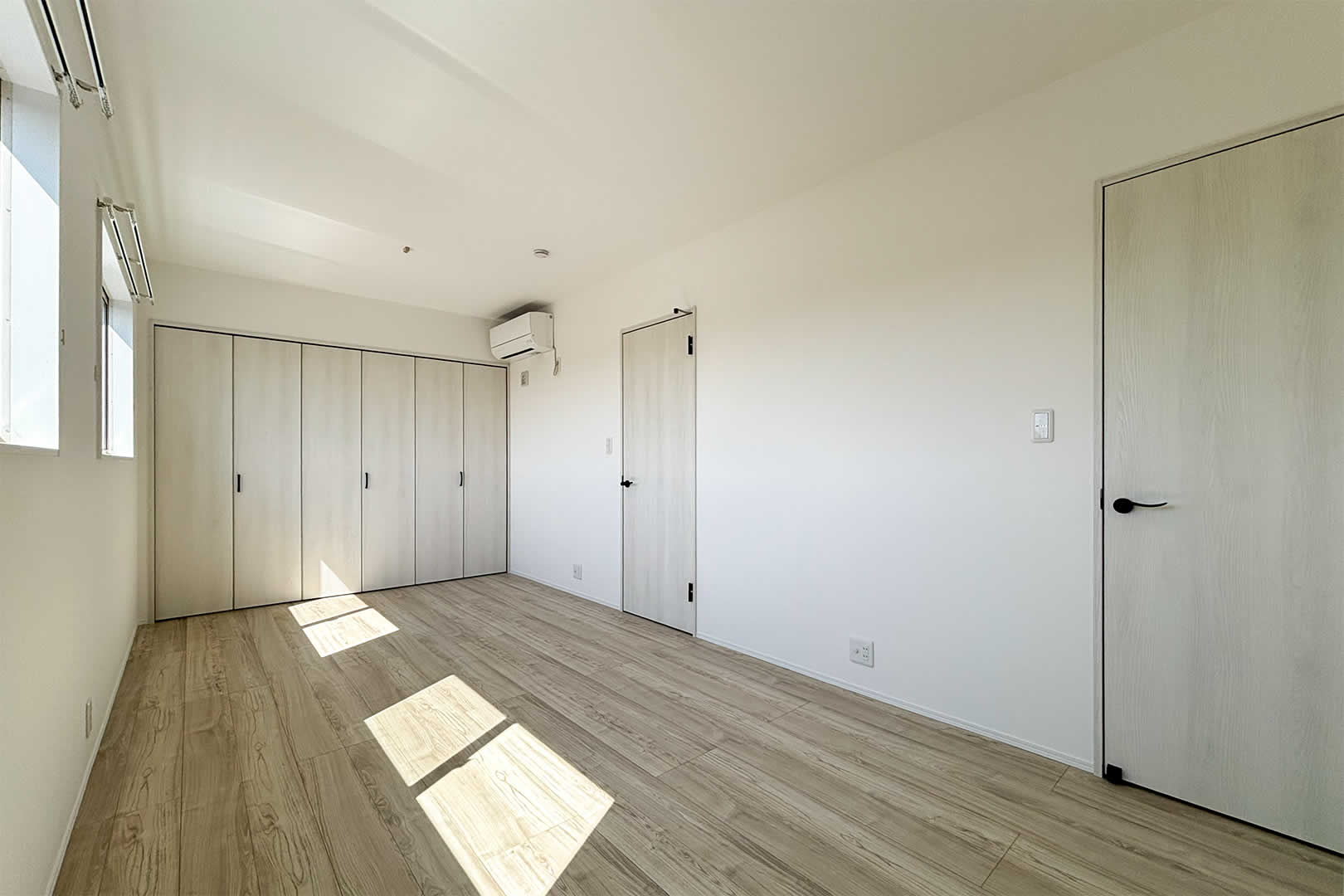 朝日が入ってくる寝室。ベットを2つ置いて丁度よい広さとなっています。