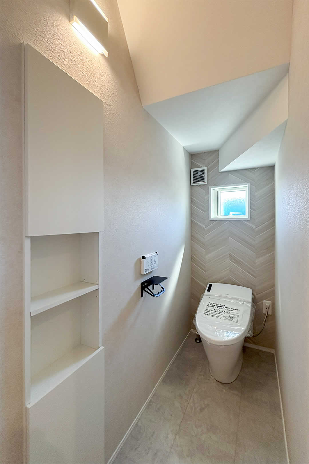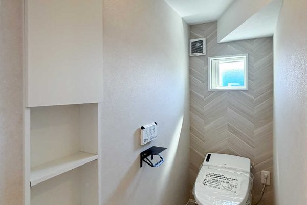 正面の壁のアクセントクロスがポイントです。階段下のトイレですが広く感じられます。