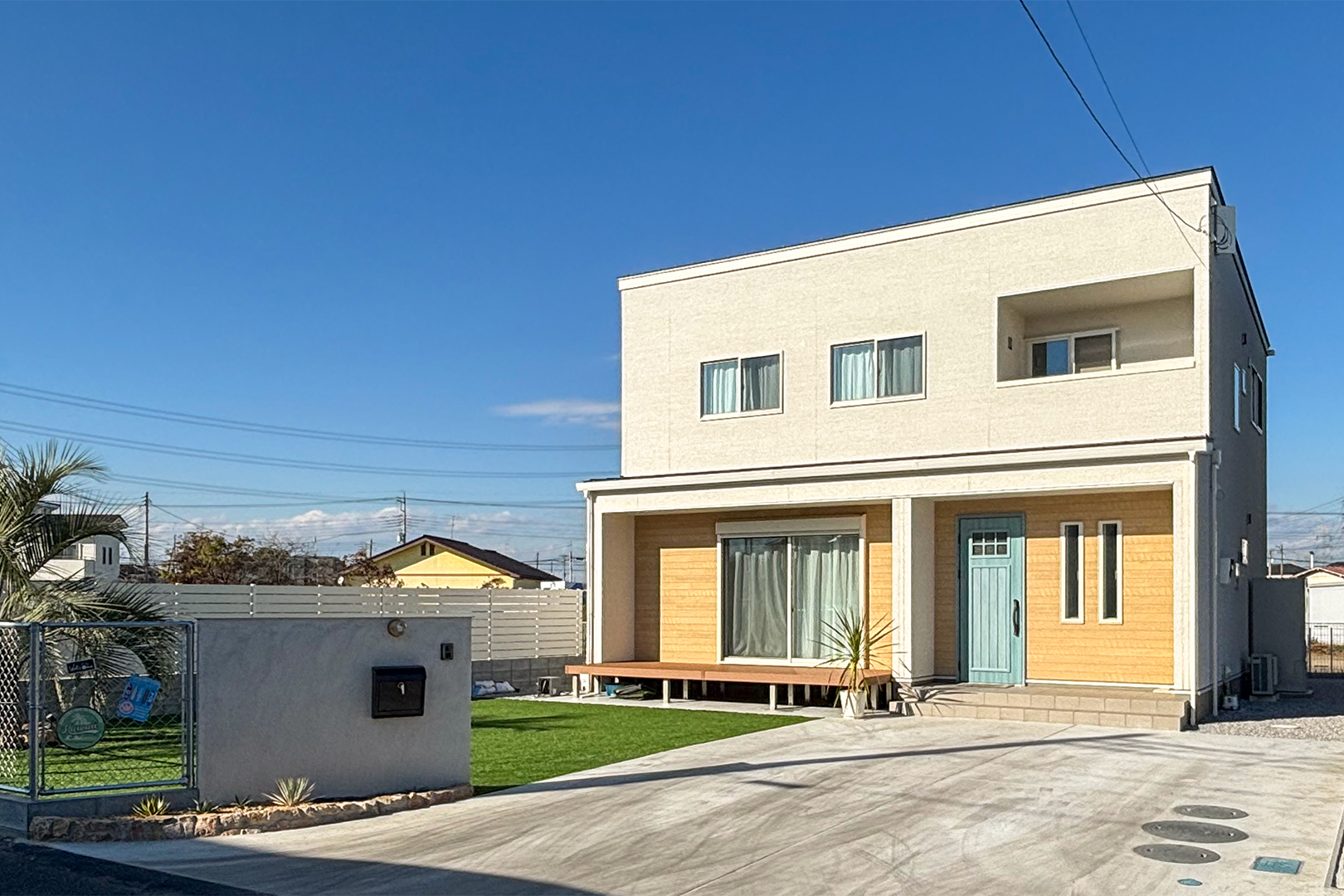 白い外壁に木調のアクセント。そしてブルーグリーンの玄関ドアがオシャレ感を引き立たせています。ヤシの木が似合う外観です。