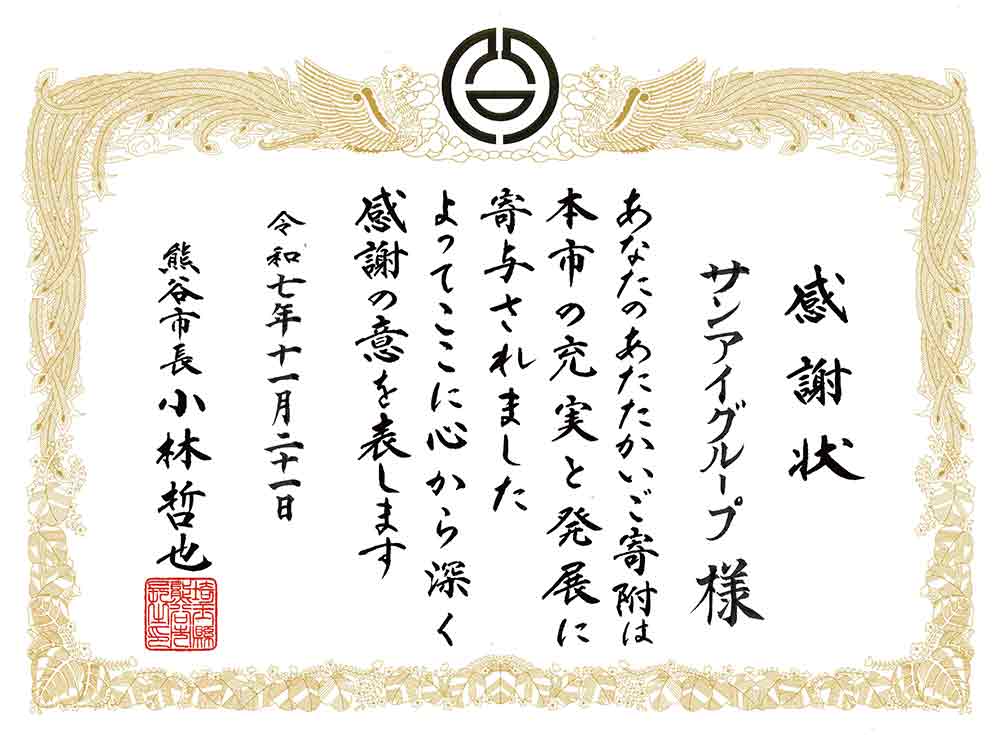 地元熊谷の未来を担っていく子供達の成長に少しでも力になれればと思い毎年寄付させていただいています。