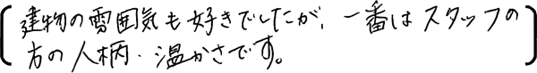 建物の雰囲気も好きでしたが一番はスタッフの方の人柄、温かさです。