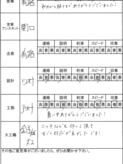 営業担当:有路 初めから終りまでありがとうございました! 営業アシスタント:関口 店長:有路 設計担当:川村 工務担当:戸村 暑い中ありがとうございました! 現場職人:金子雄大工 ニッチなども作って頂きすごく対応が良かったです!