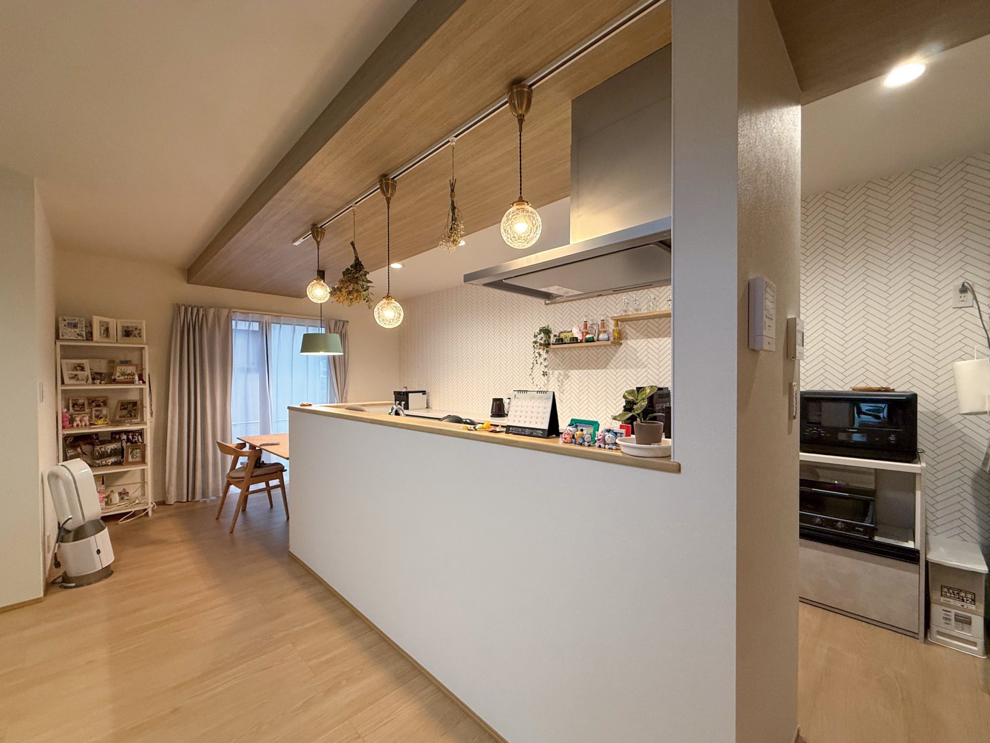 - 吹き抜けリビング、キッチンの食器棚とパントリー!!和室を子供のおもちゃスペースにしたおかげでリビングが散らからないところ。